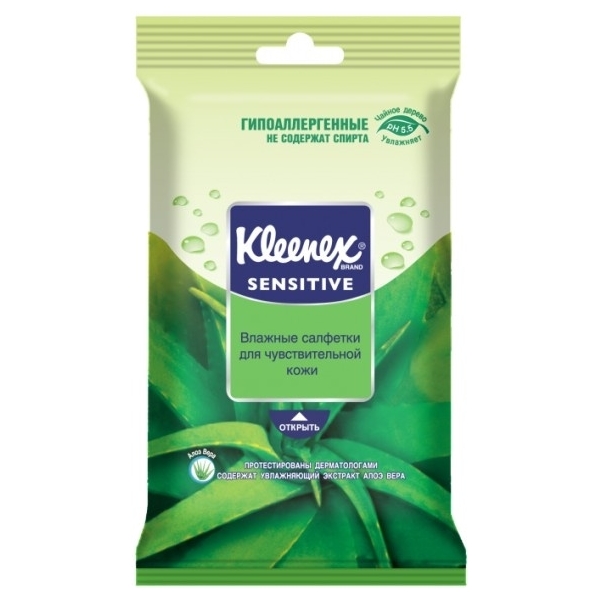 Вологі серветки Kleenex Sensitive - гіпоалергенні, не містять спирту. Призначені для чутливої шкіри. Містить зволожуючий екстракт алое вера.